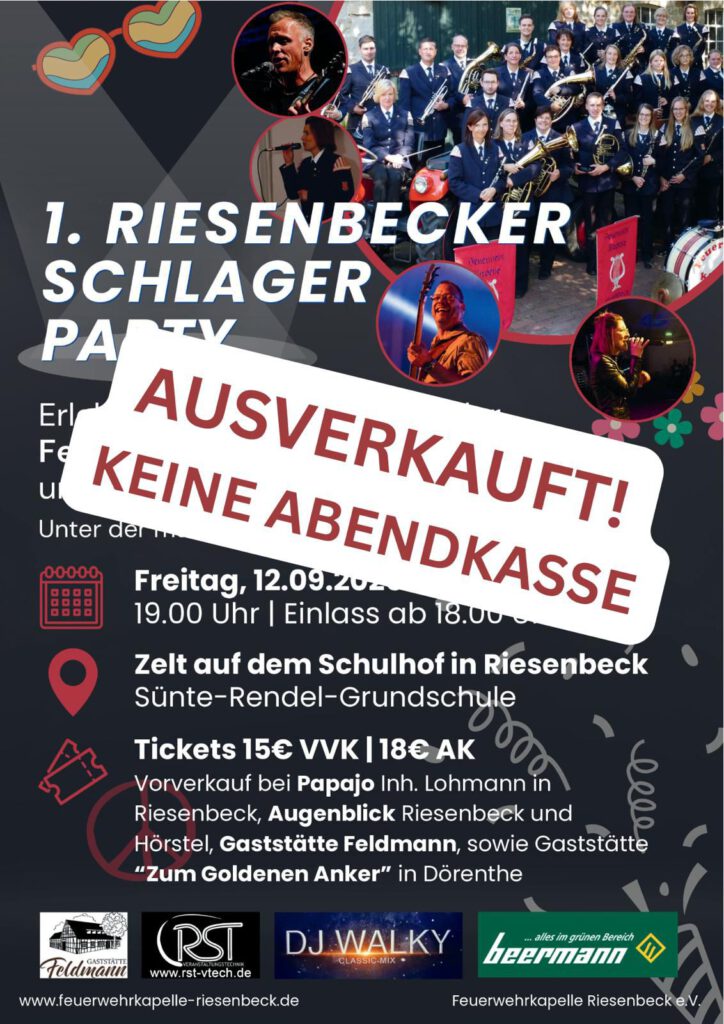 Riesenbeck – Ein Zelt voller Musik, tanzende Menschen und unzählige Hits: Die 1. Riesenbecker Schlagerparty auf dem Schulhof der Sünte-Rendel-Grundschule hat am Freitagabend, 12. September 2025, für ausgelassene Stimmung gesorgt. Organisiert von der Feuerwehrkapelle Riesenbeck in Zusammenarbeit mit der Gaststätte Feldmann, entwickelte sich der Abend schnell zu einem unvergesslichen Fest.